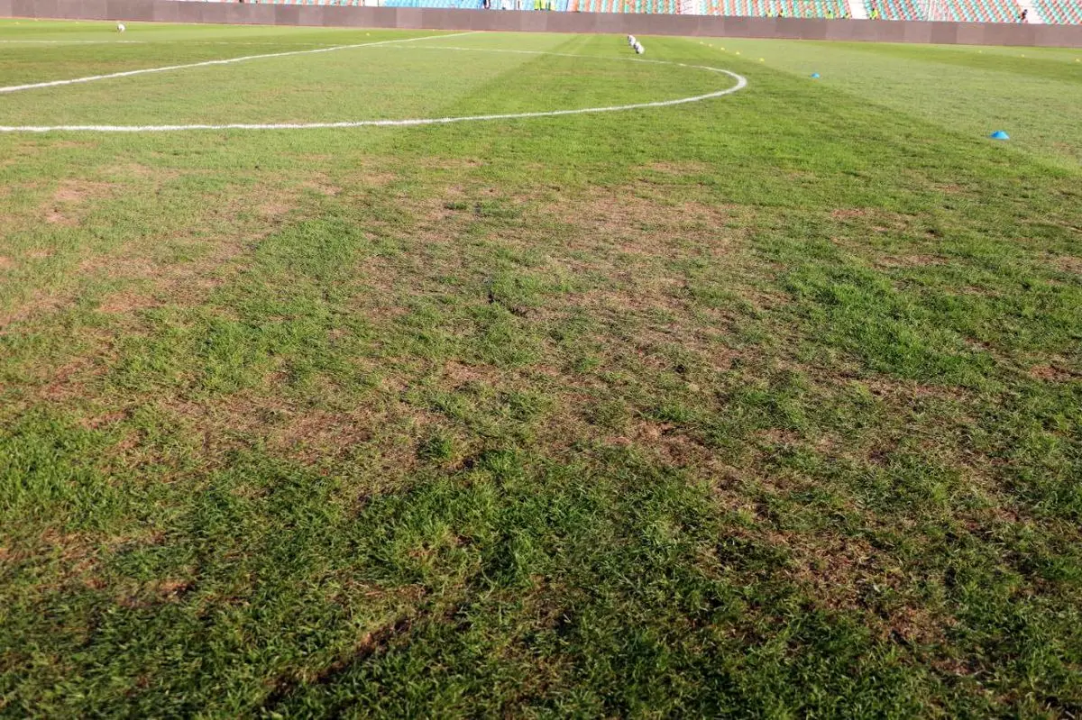 در همین راستا ویدئویی در یک برنامه تلویزیونی از وضعیت چمن منتشر شد. در این ویدیو مشخص شد که چمن ورزشگاه دچار آسیبهای جدی شده و چالهها و پستیبلندیها با سنگ پر شدهاند. همین مسئله باعث شده که بازیکنان هنگام بازی روی چمن بسیار سر بخورند، چرا که کیفیت زمین دیگر مانند گذشته نیست و استاندارد لازم برای بازی حرفهای را ندارد.